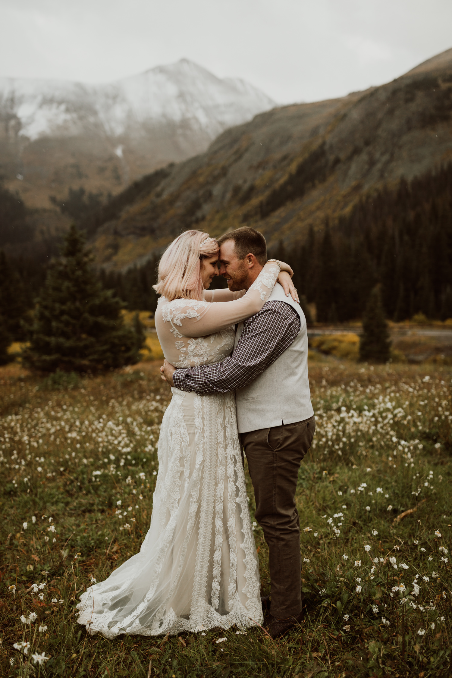 An off-the-grid cabin sitting right at tree line, a bridge suspended across a ravine, a late september snow, and a small family becoming one. Katie & Brandon’s intimate elopement at a cabin high up in the mountains near Ouray, Colorado was an ethereal experience. The weather threatened rain, but up at tree line where the cabin was, the snow flurried off and on all afternoon, making the cabin seem extra warm and inviting.